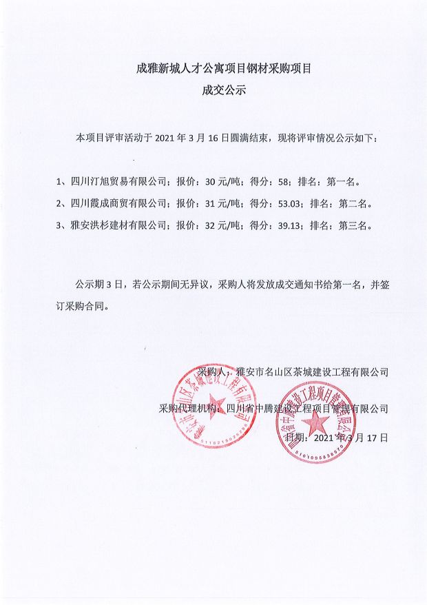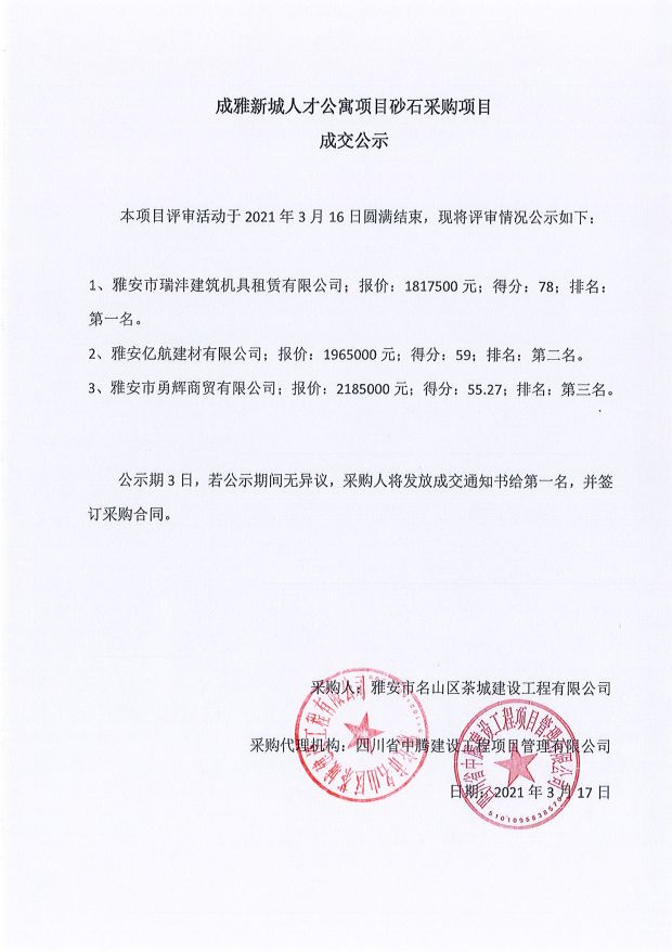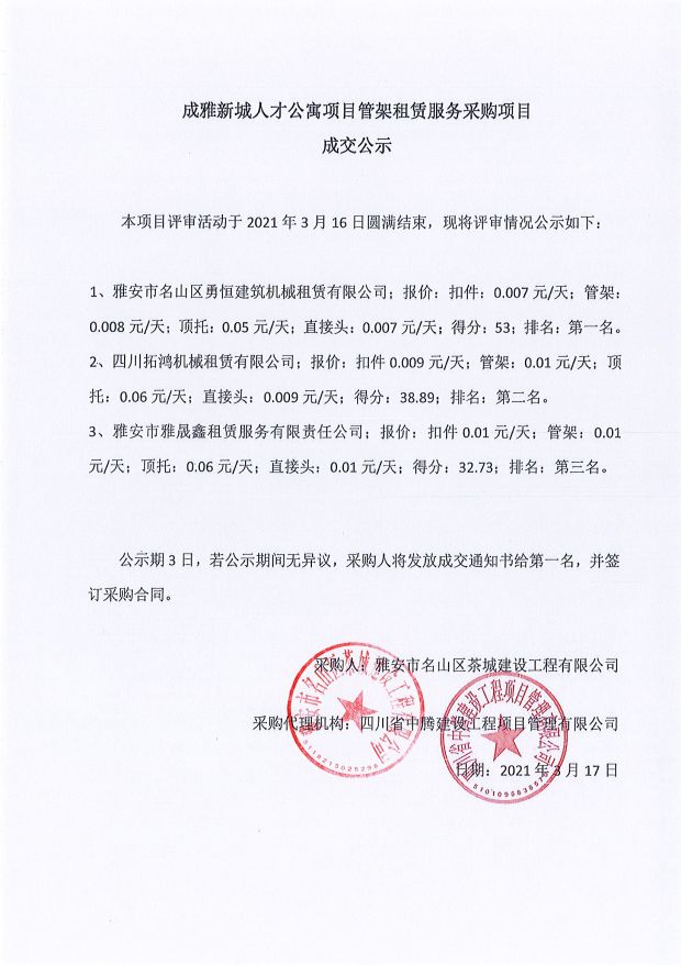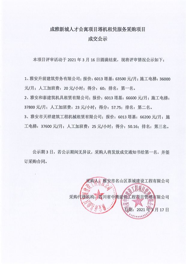 成雅新城人才公寓砂石、塔機(jī)租賃、土石方、鋼材、管架租賃、模板木方、水泥采購項(xiàng)目成交公示