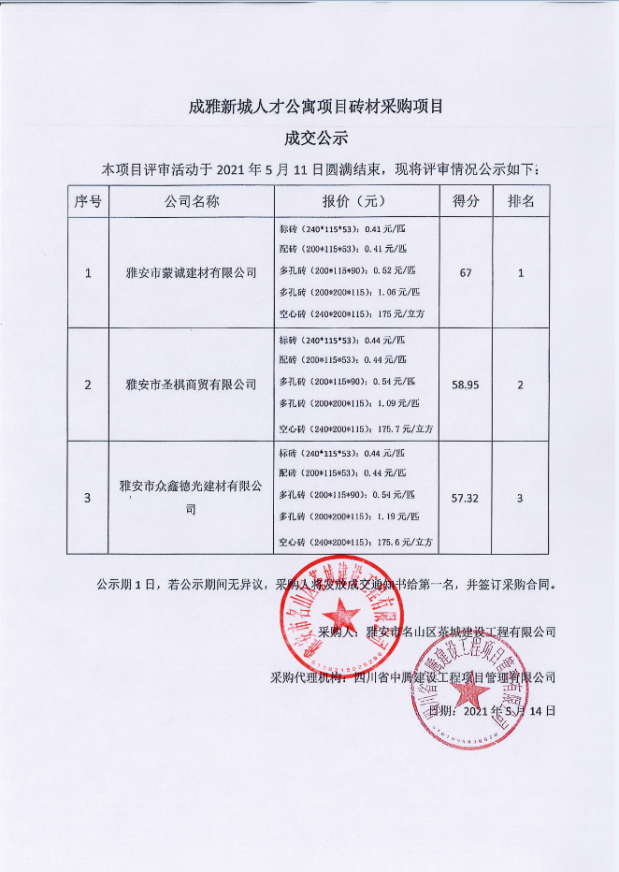 成雅新城人才公寓項(xiàng)目磚材采購成交公示
