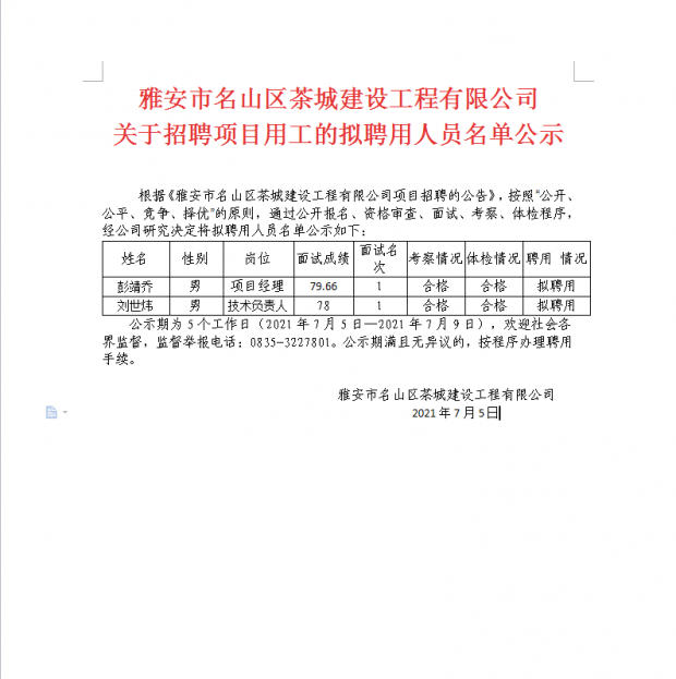 雅安市名山區(qū)茶城建設(shè)工程有限公司 關(guān)于招聘項(xiàng)目用工的擬聘用人員名單公示