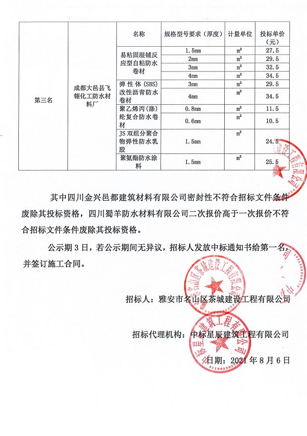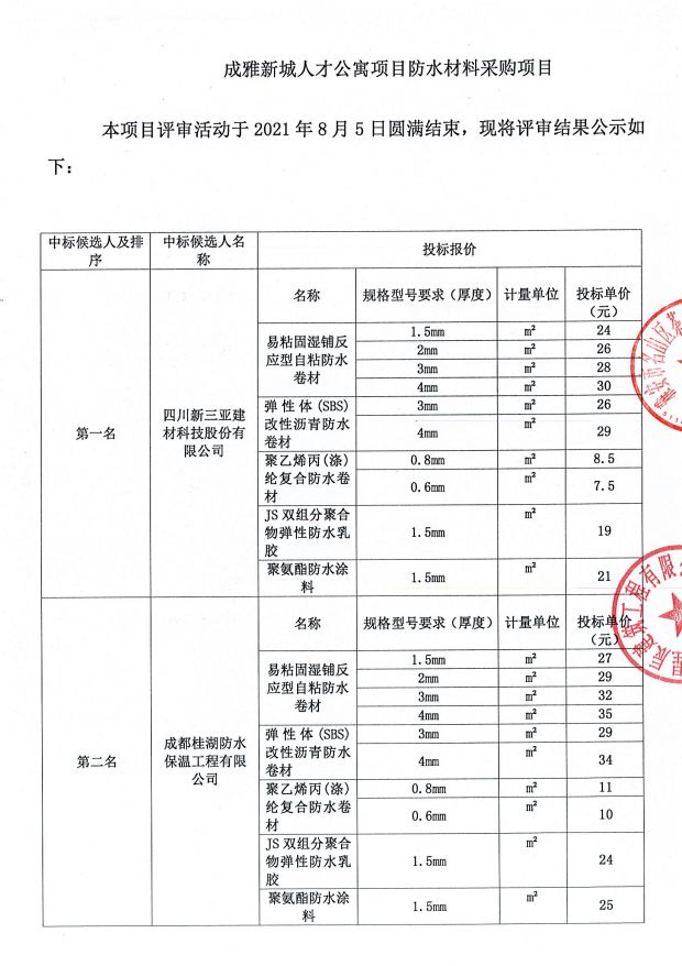 成雅新城人才公寓項目防水材料采購中標(biāo)公示