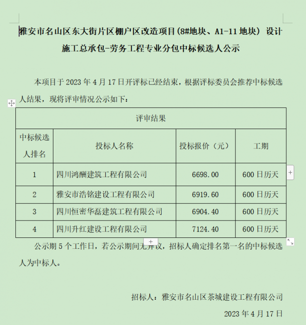雅安市名山區(qū)東大街片區(qū)棚戶區(qū)改造項目(8#地塊、A1-11地塊) 設(shè)計施工總承包-勞務(wù)工程專業(yè)分包中標(biāo)候選人公示