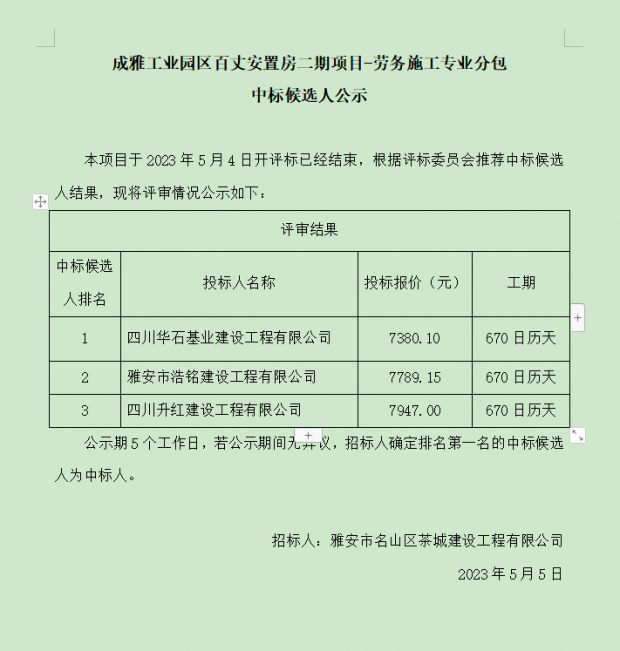 成雅工業(yè)園區(qū)百丈安置房二期項(xiàng)目-勞務(wù)施工專業(yè)分包中標(biāo)候選人公示