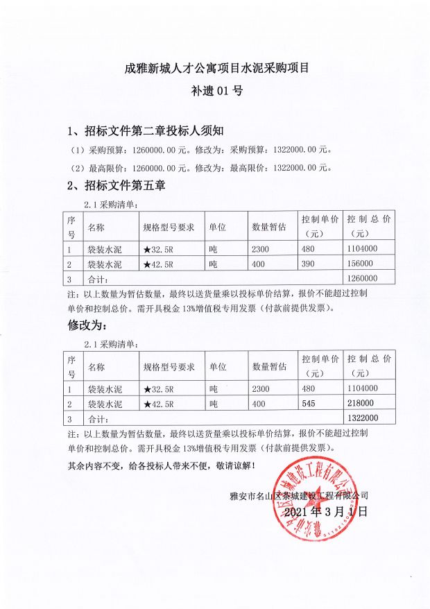 成雅新城人才公寓項(xiàng)目水泥采購項(xiàng)目補(bǔ)遺01號(hào)